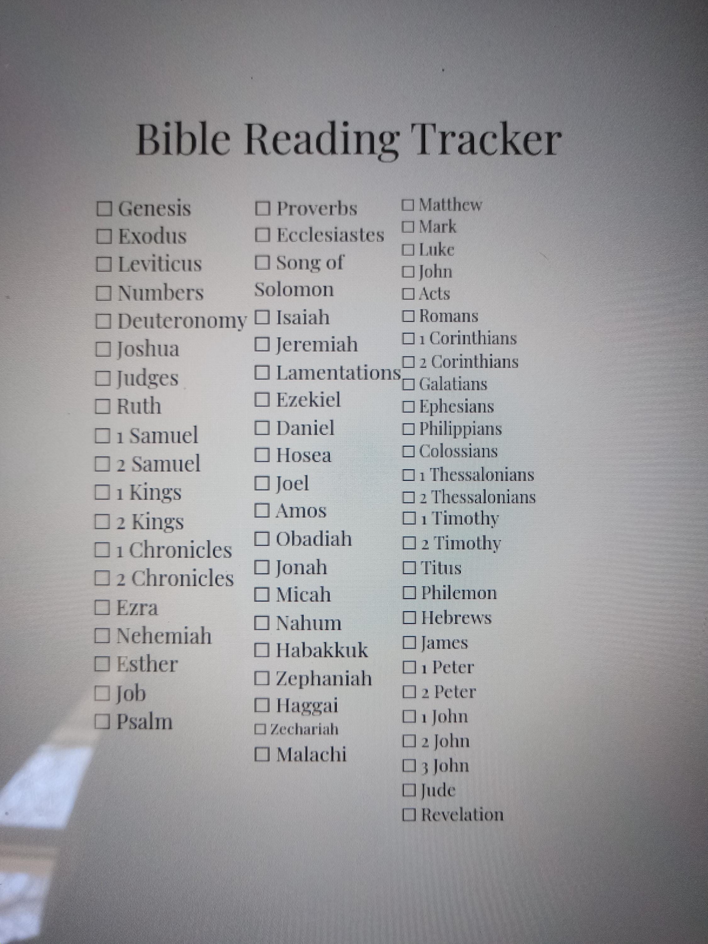 •A Bible Reading Tracker to help you keep track of your reading.
